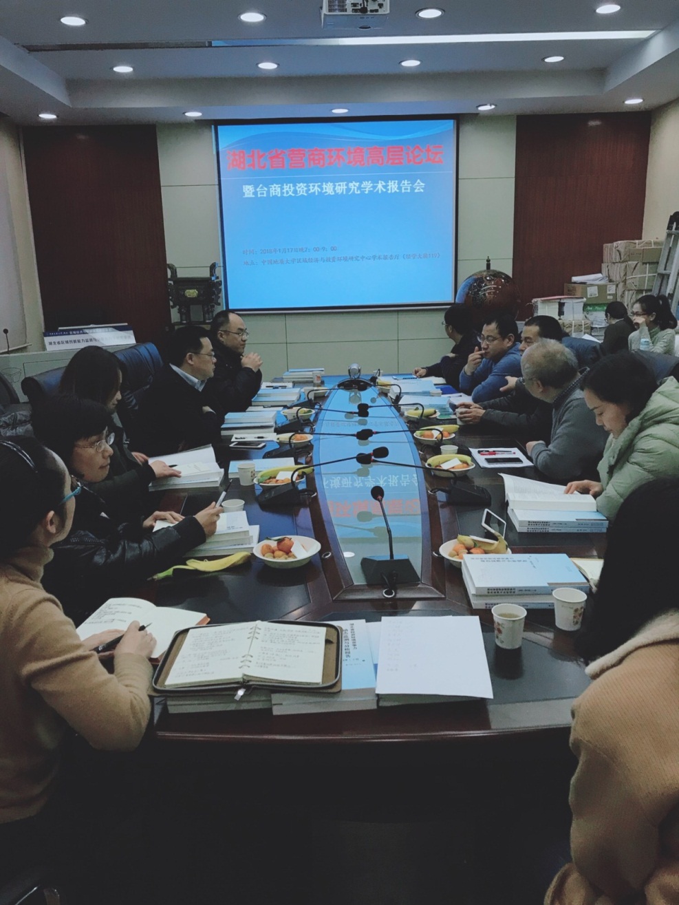 (通讯员吴磊、谢伟伟)2018年1月17日,“湖北省营商环境高层论坛暨台商投资环境研究学术报告会”在中国地质大学(武汉)区域经济与投资环境研究中心学术报告厅举行。湖北省台办王光斌处长、朱琨科长,经管学院杨树旺副院长、区域经济与投资环境研究中心邓宏兵教授,以及相关研究领域的专家、师生代表共计30余人参加了会议。邓宏兵教授主持了会议。