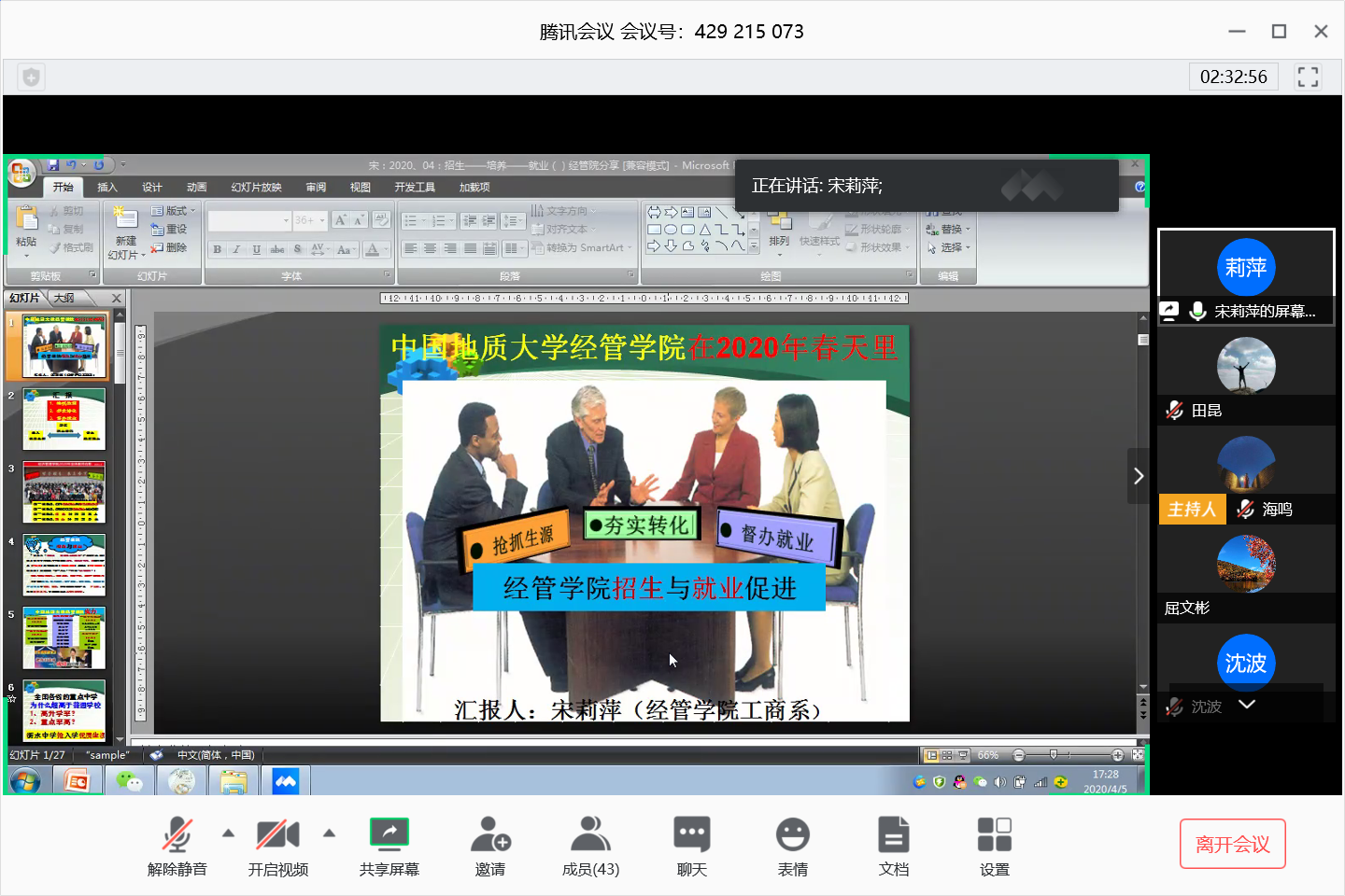 院长杨树旺肯定了与会老师的发言。他提出,招生和就业都是关乎人才培养质量的重要环节。新高考的变化使得招生工作从学校层面直接下沉到各专业,影响到了专业发展,要顺应潮流,充分利用线上方式和新媒体工具做好宣传工作。针对疫情对学院的就业工作的影响,杨院长要求各系提高政治站位,学工组提供具体指导,系主任、班主任、导师齐抓共管,用好校友在内的各项资源,全力做好就业工作。要求班子成员对口联系各系,督促工作落实招生和就业工作。